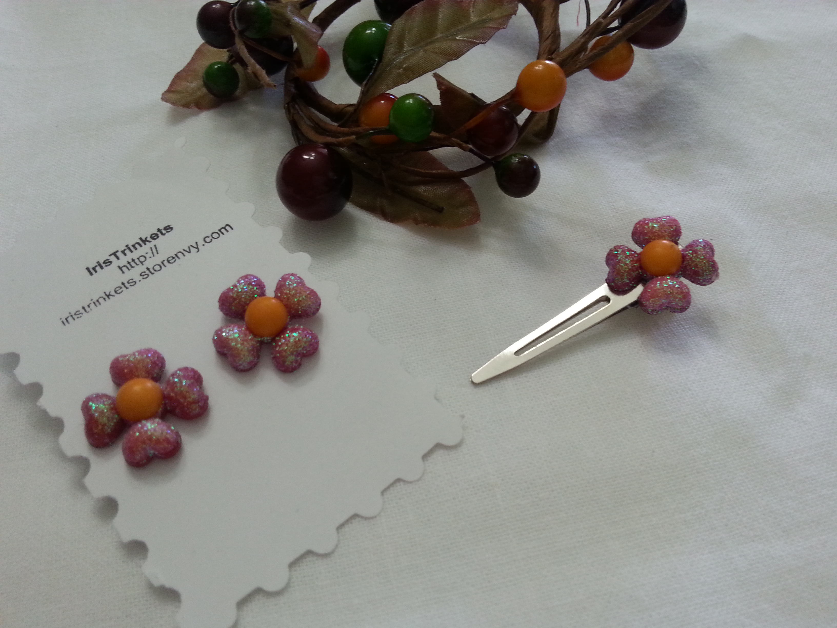 This set features a pair of earrings in pink and orange, and a hair clip featuring the same design. It is a simple, yet dainty set for young girls to enjoy.
