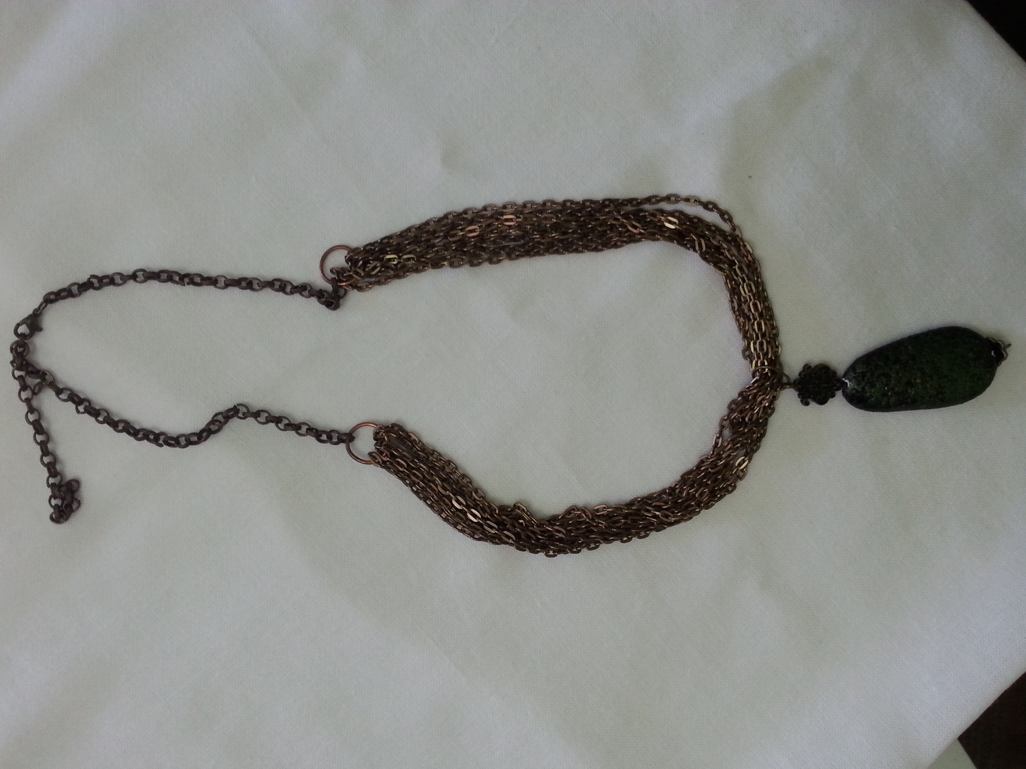 This stunning necklace features metal elements and an emerald green stone pendant that hangs artistically on chains that are carefully chosen to achieve that simple yet elegant mixed-media look.