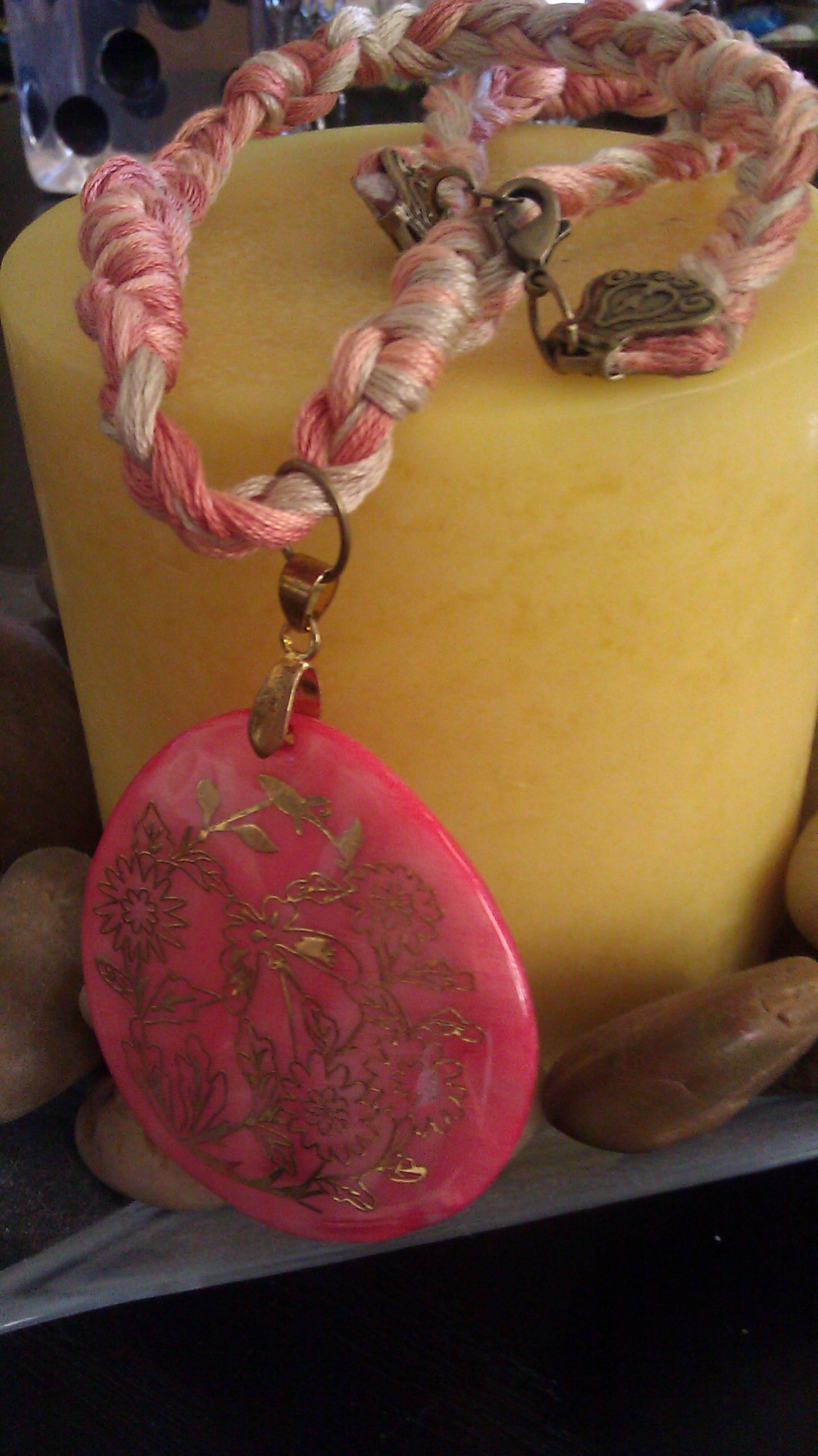 This hand-weaved necklace is crafted using shades of peach strands and a shell pendant with gold etchings. This is a great accessory to wear on top of a neutral top.