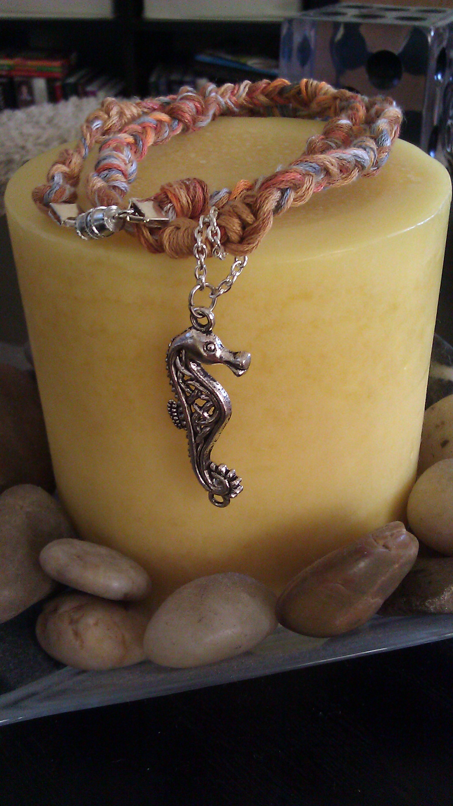 This seahorse inspired necklace was constructed with the use of shades of titian, grey and amber to capture the colors of the common seahorse (scientifically named H. Kuda). This necklace makes a simple statement!